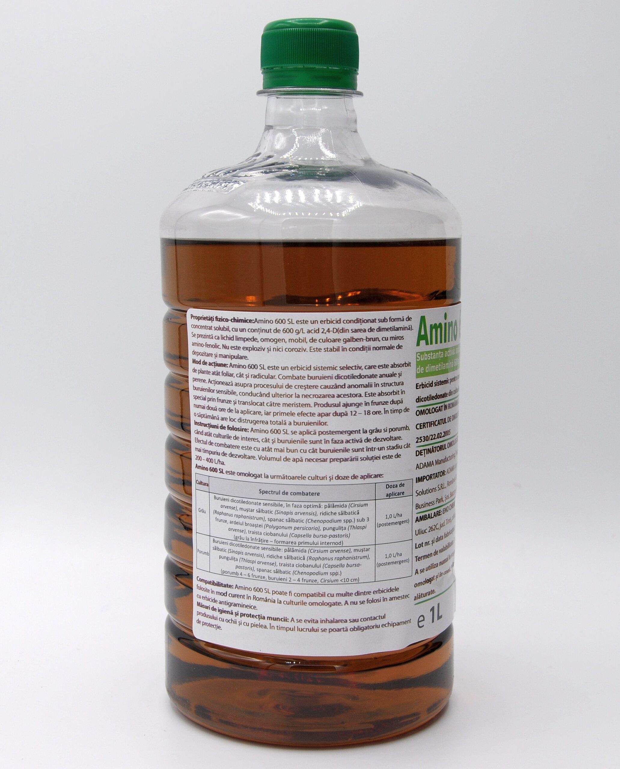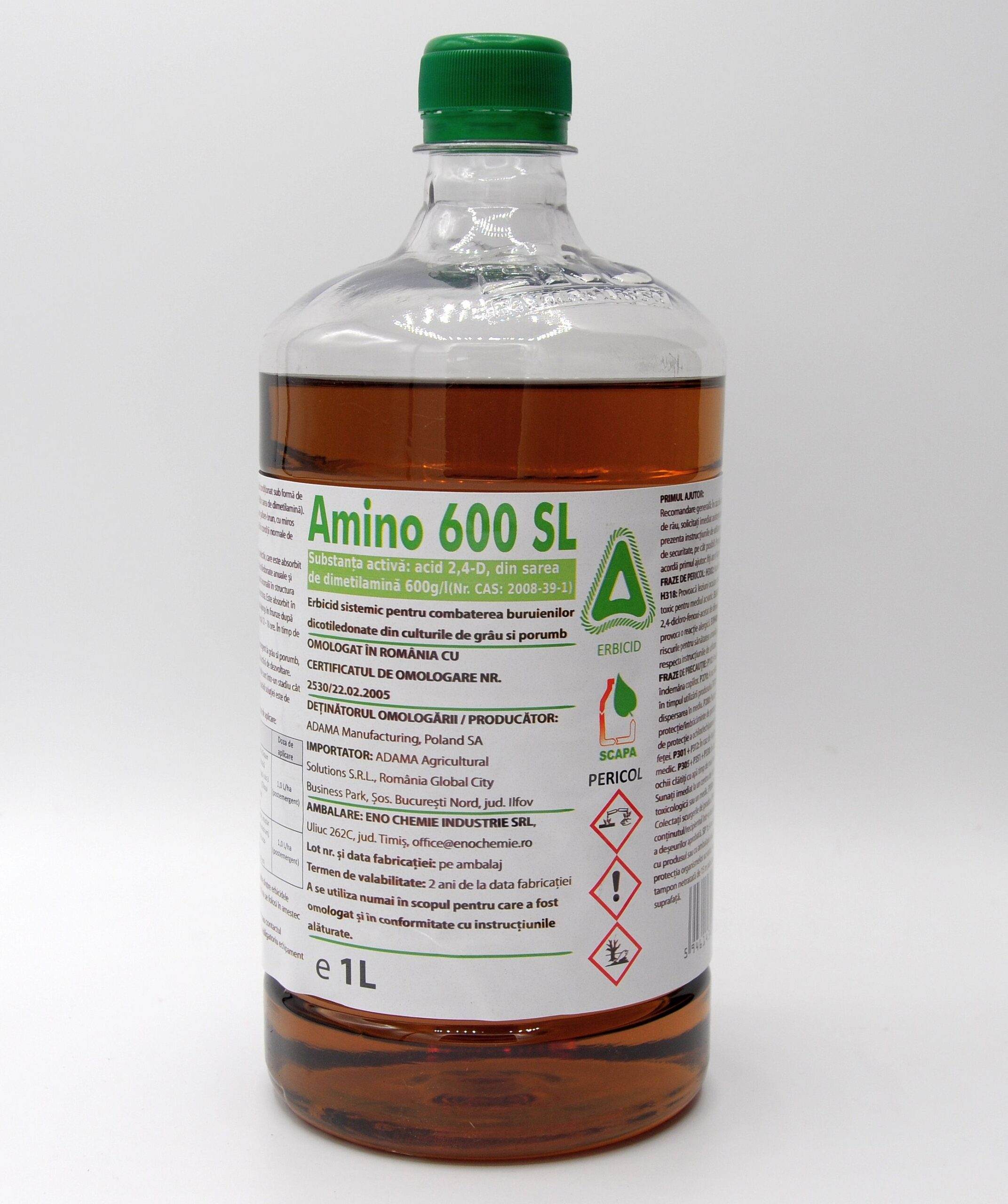 MOD DE ACȚIUNE: Amino 600 SL este un erbicid sistemic selectiv, absorbit de plante atât foliar, cât și radicular. Combate buruieni dicotiledonate anuale şi perene. Acționează asupra procesului de creștere cauzând anomalii în structura buruienilor sensibile, conducând ulterior la necrozarea acestora. Este absorbit în special prin frunze și translocat către zonele de crestere. Translocarea este influențată de speciile de buruieni, de nivelul acestora de dezvoltare, precum și de unele condiții de mediu, cum ar fi intensitatea luminii, umiditatea relativă, umezeala din sol și temperatura. Produsul ajunge în frunze după numai două ore de la aplicare, iar primele efecte apar după 12 – 18 ore. În timp de o săptămână are loc distrugerea totală a buruienilor.