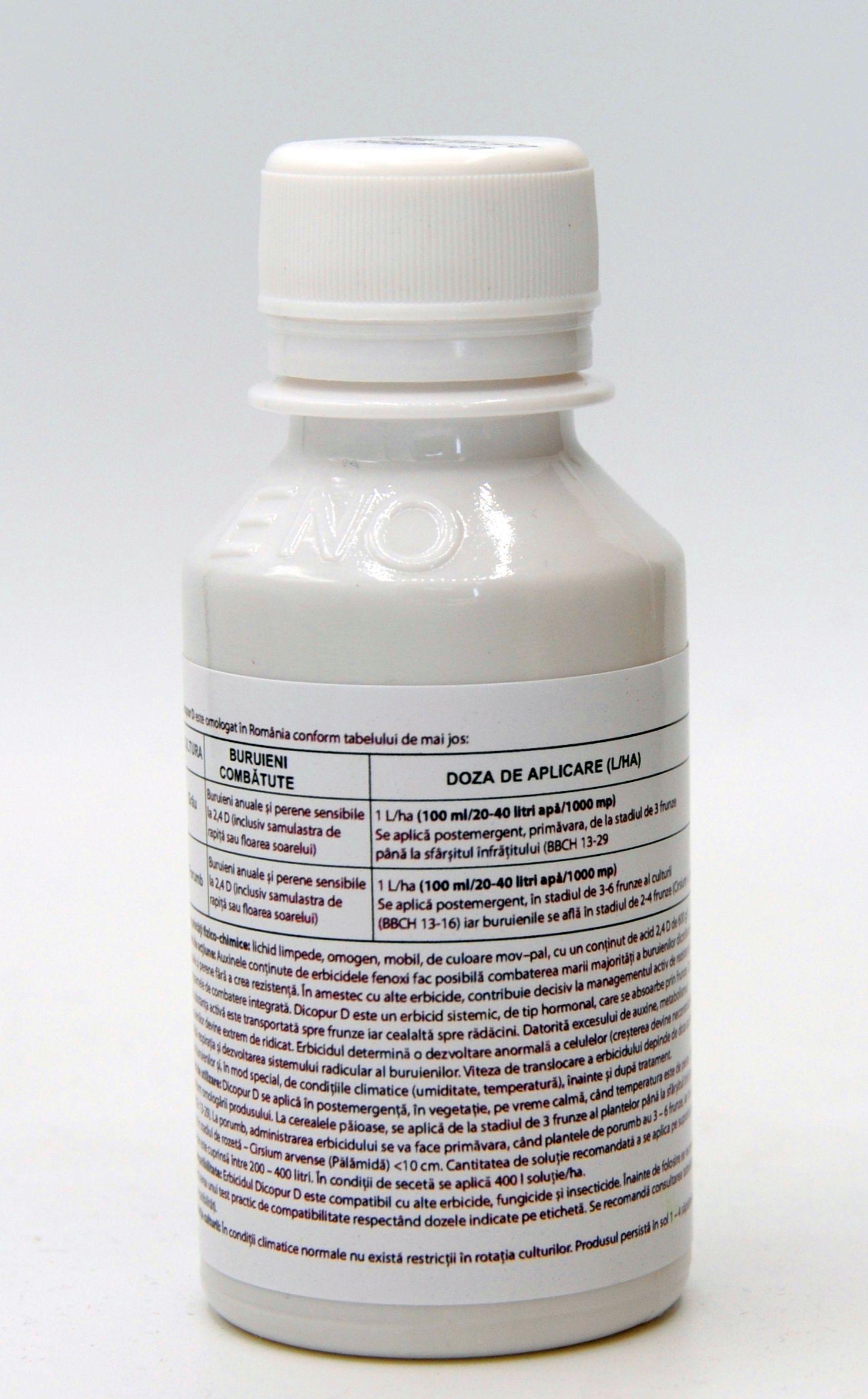 Mod de utilizare: Dicopur D se aplică în postemergență, în vegetație, pe vreme calmă, când temperatura este de peste 15°C, conform omologării produsului. La cerealele păioase, se aplică de la stadiul de 3 frunze al plantelor până la sfârșitul înfrățitului (BBCH 13-29). La porumb, administrarea erbicidului se va face primăvara, când plantele de porumb au 3 – 6 frunze, iar buruienile sunt în stadiul de rozetă – Cirsium arvense (Pălămidă) <10 cm. Cantitatea de soluție recomandată a se aplica pe suprafața de un hectar este cuprinsă între 200 – 400 litri. În condiții de secetă se aplică 400 l soluție/ha.