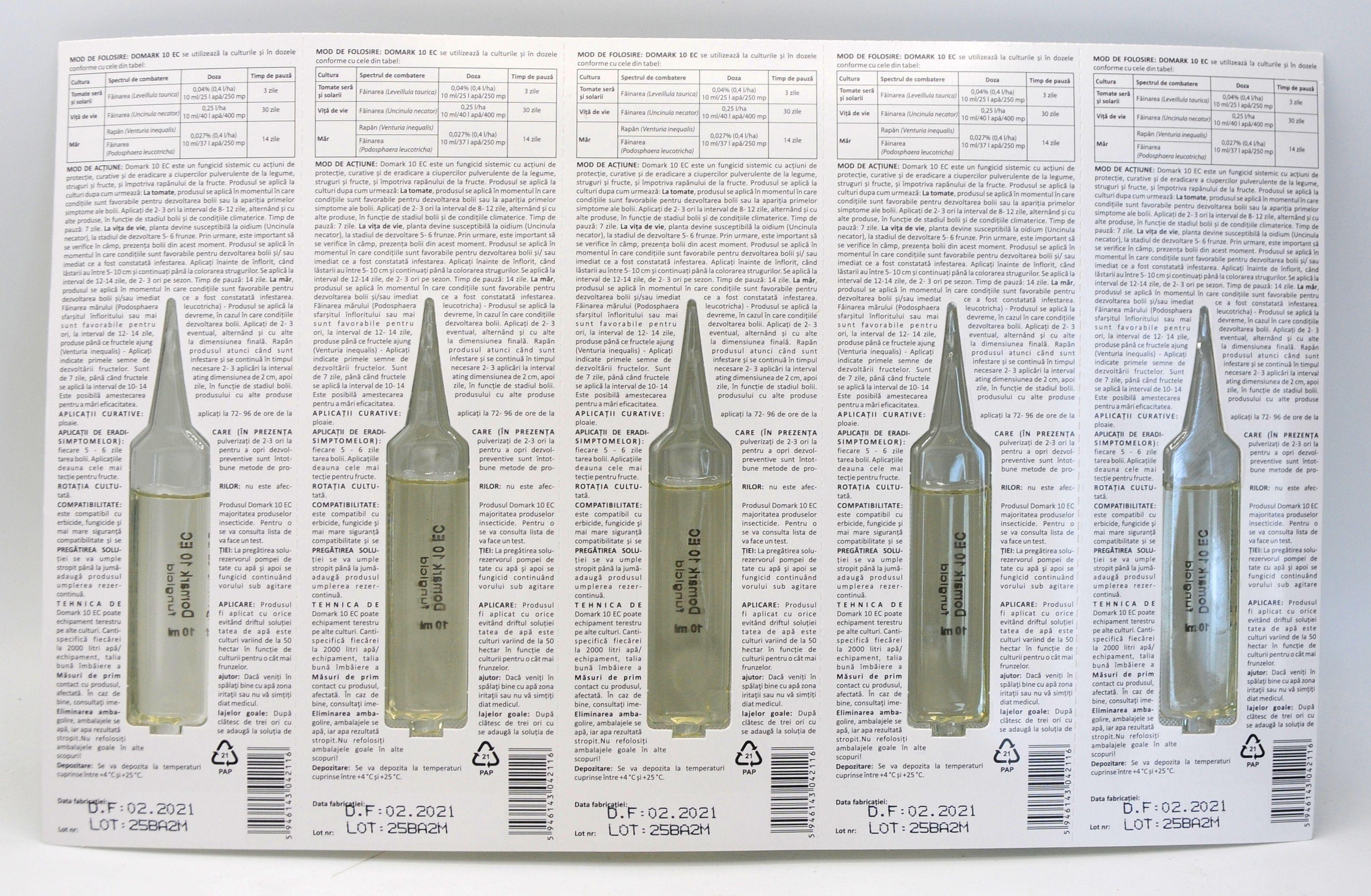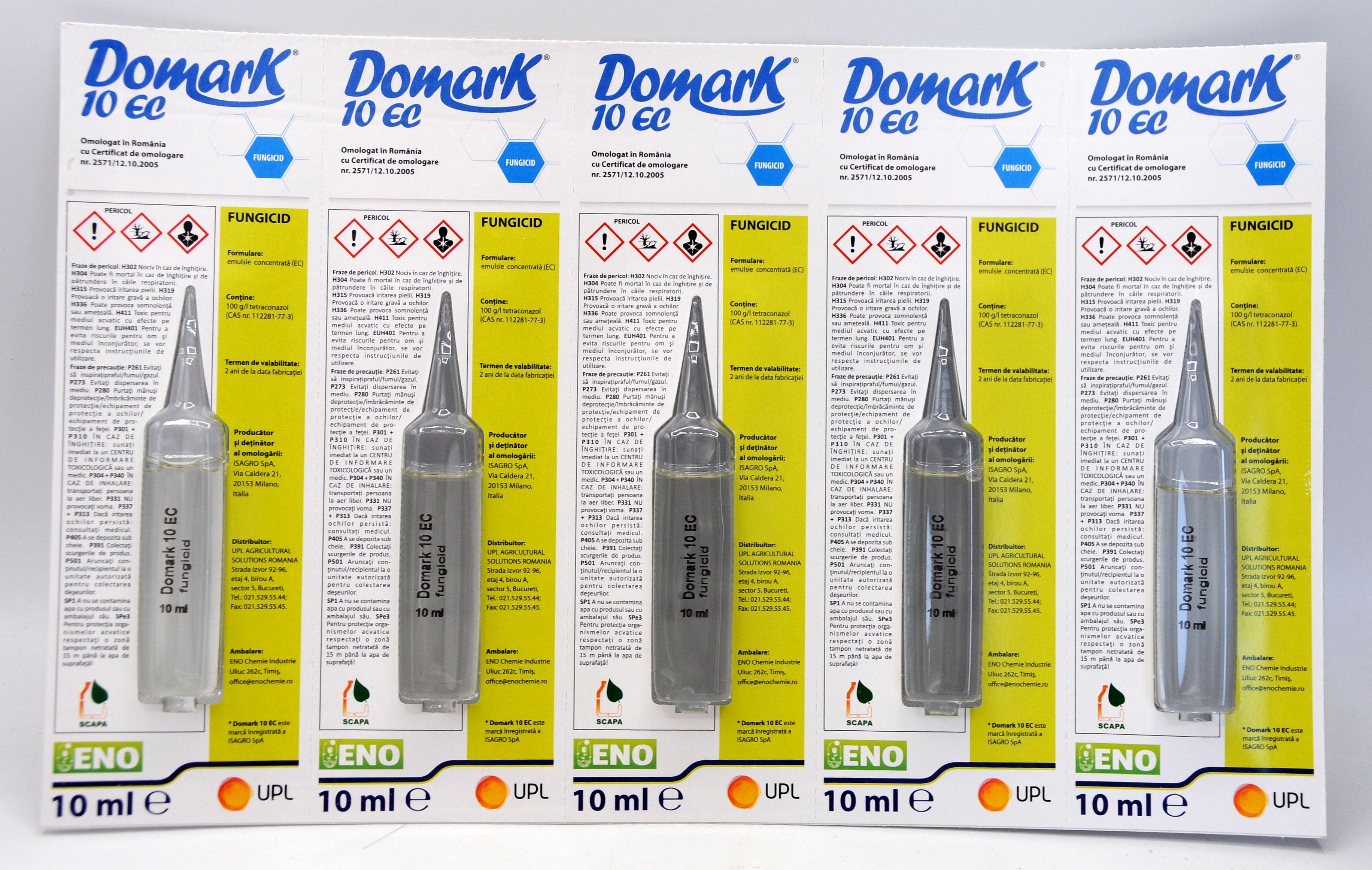 MOD DE ACŢIUNE: DOMARK 10 EC este un fungicid sistemic cu acţiuni deprotecţie, curative şi de eradicare a ciupercilor pulverulente de la legume, struguri şi fructe, şi împotriva rapănului de la fructe. Produsul se aplică la culturi astfel: La tomate, produsul se aplică în momentul în care condiţiile sunt favorabile pentru dezvoltarea bolii sau la apariţia primelor simptome. Aplicaţi de 2-3 ori la interval de 8-12 zile, alternând şi cu alte produse, în funcţie de stadiul bolii şi de condiţiile climaterice. Timp de pauză 7 zile. La viţa de vie, planta devine susceptibilă la oidium (Uncinula necator), la stadiul de dezvoltare 5- 6 frunze. Produsul se aplică în momentul în care condiţiile sunt favorabile pentru dezvoltarea bolii şi/ sau imediat ce a fost constatată infestarea. Aplicaţi înainte de înflorit, când lăstarii au intre 5-10 cm şi continuaţi pănă la colorarea strugurilor. Se aplică la interval de 12-14 zile, de 2- 3 ori pe sezon. Timp de pauză 14 zile. La măr, produsul se aplică în momentul în care condiţlile sunt favorabile pentru dezvoltarea bolii şi/ sau imediat ce a fost constatată infestarea. Făinarea mărului (Podosphaera leucotricha) – Produsul se aplică la sfârşitul înfloritului sau mai devreme, încazul în care condiţiile sunt favorabile pentru dezvoltarea bolii. Aplicaţi de 2-3 ori, la interval de 12- 14 zile, eventual, alternând şi cu alte produse până ce fructele ajung la dimensiunea finală. Rapăn (Venturia inequalis) – Aplicaţi produsul atunci când sunt indicate primele semene de infestare şi se continuă în timpul dezvoltării fructelor. Sunt necesare 2- 3 aplicări la interval de 7 zile, pănă când fructele ating dimensiunea de 2 cm, apoi se aplică la interval de 10-14 zile, în funcţie de stadiul bolii. Este posibilă amestecarea produsului cu alte produse pentru a mări eficacitatea. Aplicații curative: aplicaţi la 72- 96 de ore de la ploaie.