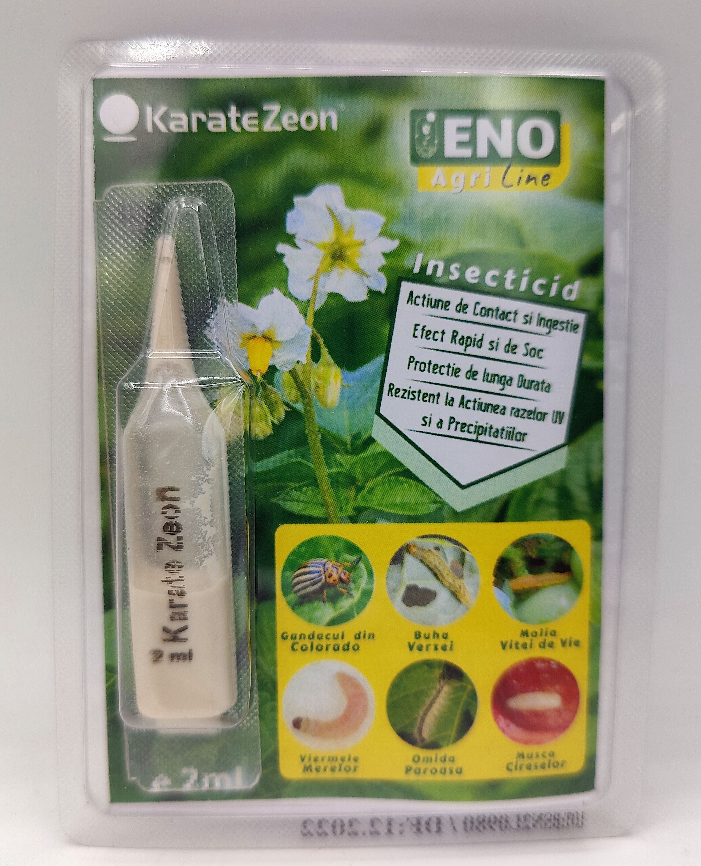 Recomandări de utilizare: KARATE ZEON se aplică prin stropiri, la avertizare, ȋn timpul perioadei de vegetație. Se umple pe jumătate rezervorul mașinii de stropit cu apă curată. Se adaugă cantitatea necesară de KARATE ZEON și se completează cu apă, agitȃndu-se continuu pȃnă la umplere. Pentru a se asigura un efect maxim de combatere se recomandă o acoperire cȃt mai bună și uniformă a culturilor tratate. Se va evita aplicarea la temperaturile ridicate din timpul zilei, cȃnd dăunătorii sunt puțin expuși și fotodegradarea este intensă. Nu se vor aplica mai mult de 3 tratamente cu produsul KARATE ZEON pe sezon.