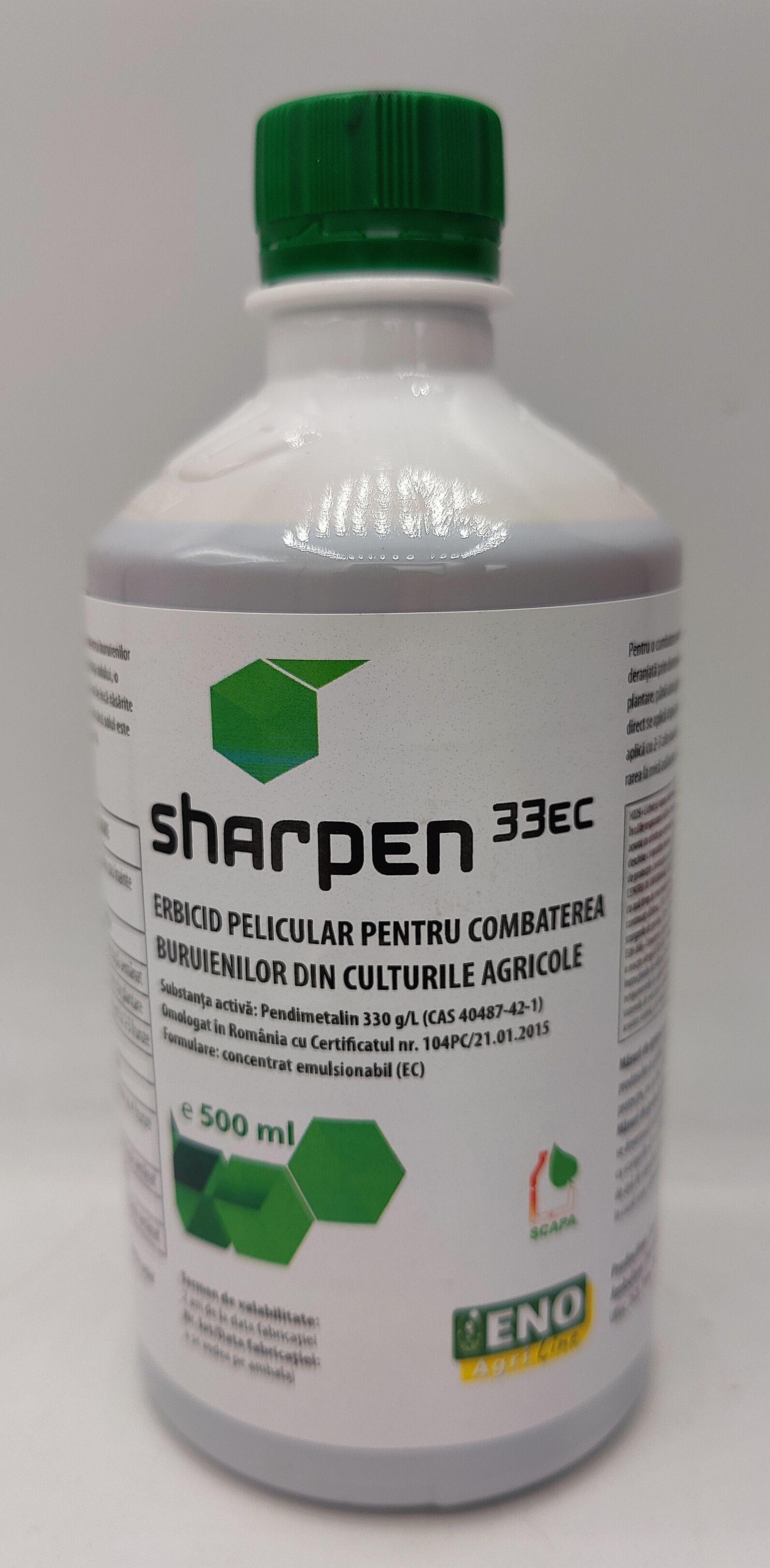 Sharpen 33 EC este un erbicid rezidual preemergent și postemergent, destinat combaterii buruienilor monocotiledonate și unele dicotiledonate din culturile agricole. Este absorbit prin vârfurile de creștere ale hipocotilului sau ale părții supraterane. Erbicidul inhibă germinația semințelor de buruieni. Produsul are acțiune de lungă durată.