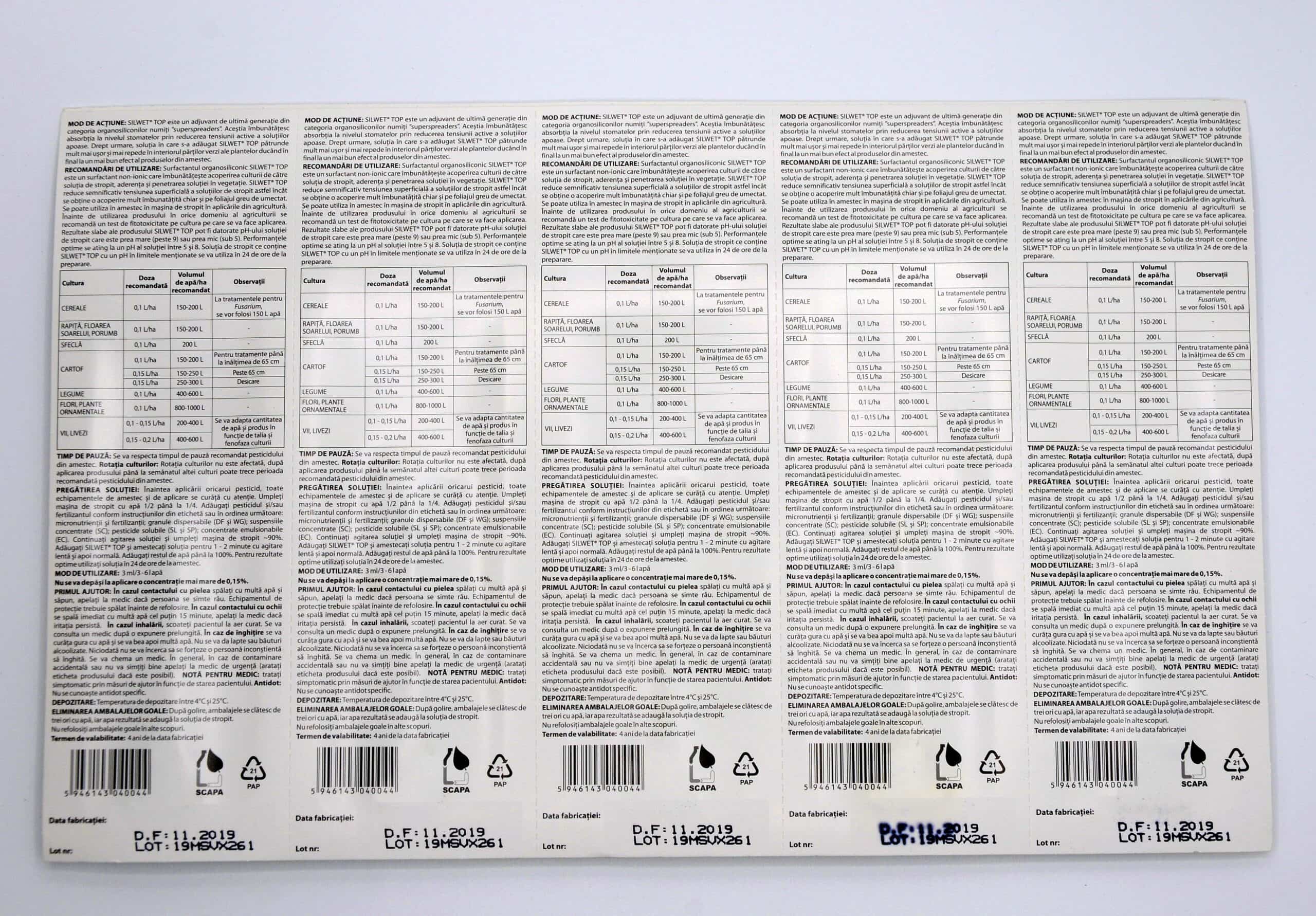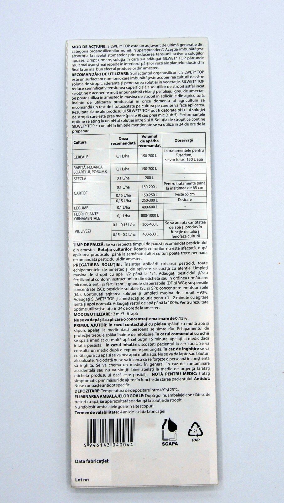 Tehnica de aplicare: Produsul Silwet Top poate fi aplicat cu orice echipament terestru sau aerian evitând driftul soluției pe alte culturi . Cantitatea de apă este specifică fiecărei culturi în funcție de echipament, talia buruienilor pentru o cât mai bună îmbăiere a buruienilor cu recomandarea generală de reducere a volumului de soluție cu 30-40 % față de volumul utilizat în mod normal.