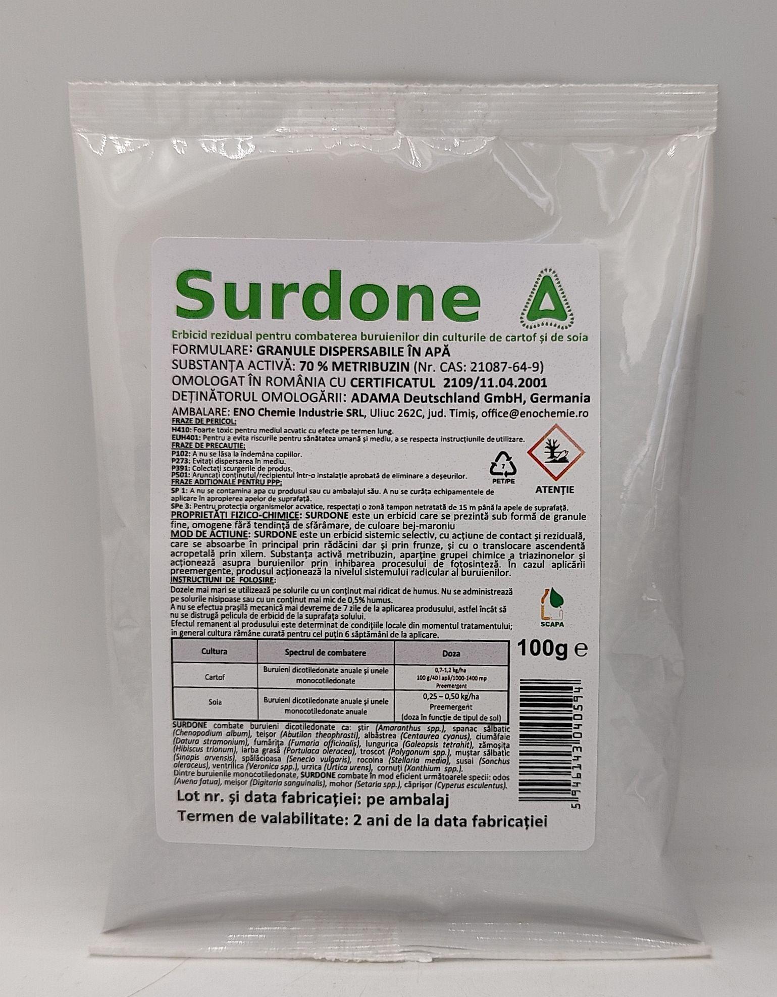 INSTRUCȚIUNI DE FOLOSIRE: Produsul SURDONE se aplică preemergent pentru combaterea buruienilor dicotiledonate anuale și a unora monocotiledonate din culturile de cartof și de soia.