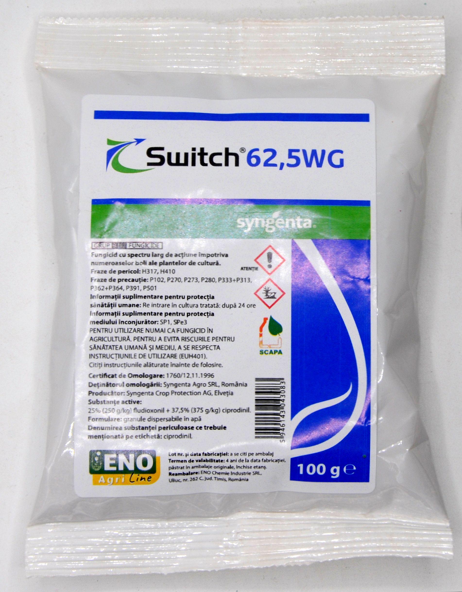 SWITCH 62,5 WG este rezistent la spălare la 2 ore după aplicare. Produsul are acțiune multiplă, blocȃnd bolile ȋn 4 locuri distincte: germinarea sporilor, creșterea tubului germinativ, penetrarea ȋn plantă și creșterea miceliului inter și intra celular.