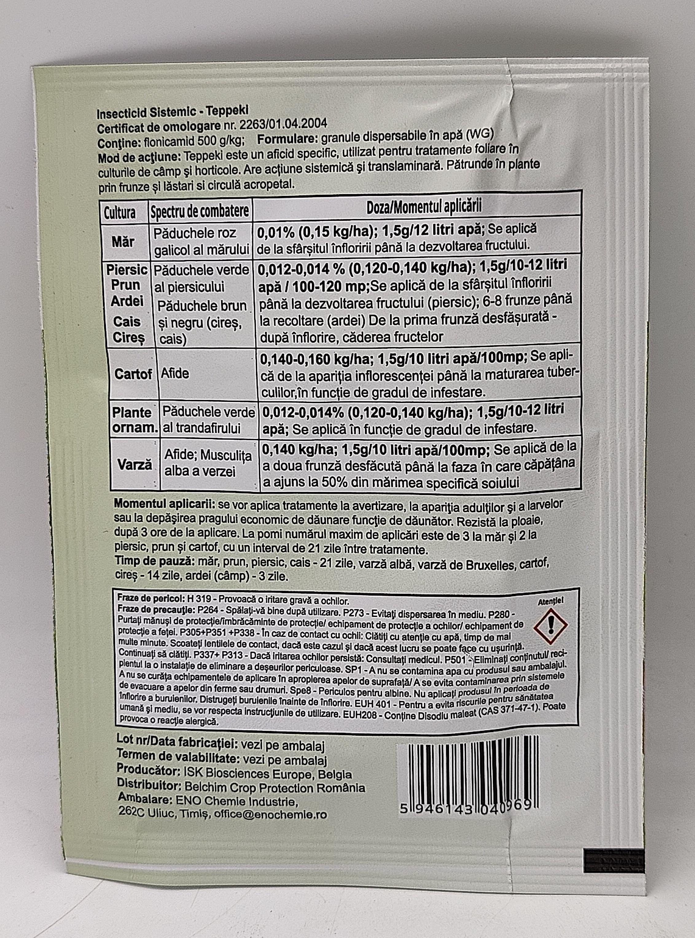 Mod de acţiune: Teppeki este un aficid specific, utilizat pentru tratamente foliare în culturile de câmp şi horticole. Are acțiune sistemică şi translaminară. Pătrunde în plante prin frunze și lăstari si circulă acropetal.